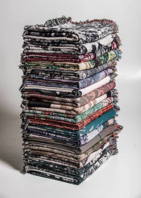 Each blanket in the stack depicts images of lynching or killing. They capture extreme human brutal experiences in objects designed for comfort, warmth and safety.
